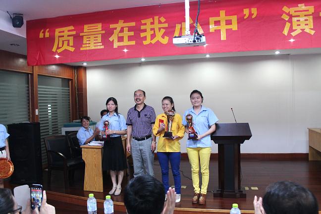十位選手聲情并茂的精彩演講后,經過裁判的認真評分和工作人員的緊張計算,主持人現場揭曉了比賽結果,李華英、鄭瓊、李雅分獲比賽前三名。孫錦龍、吳益民、蔣忠燦等公司領導獲獎選手頒獎。