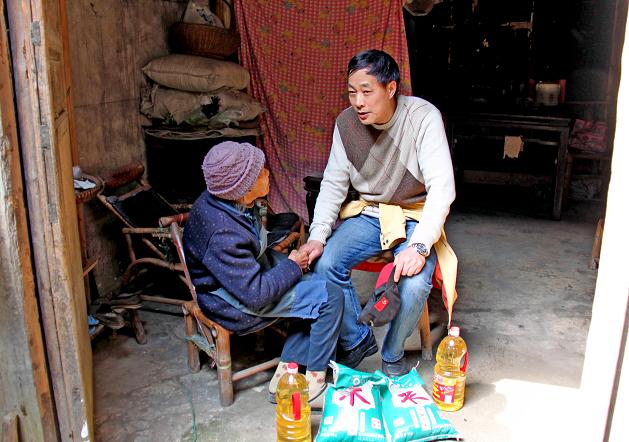 事情是這樣的:富陽某地有一位年逾九旬的孤寡老人,身有殘疾,孤苦伶仃,家徒四壁,生活很是窮苦,緊靠一個親戚接濟,定期送些大米蔬菜藉以度日。三年前丁關根因公出差路過此地,發現了這位老人,攀談之余同情、憐憫之心油然而生,于是抽空前往探視慰問,送去現金,還多次為老人購買大米、食用油等生活用品,關心照顧老人的生活。阿婆對這位從不留下姓名的無名英雄感激涕零,稱贊不已。