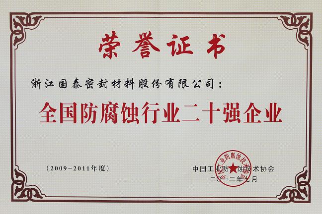 國泰密封榮獲“2009-2011年度全國防腐蝕行業20強企業”(綜合排名第七)和“2009-2011年度全國防腐蝕壓力管道企業20強”(綜合排名第二)兩項榮譽。